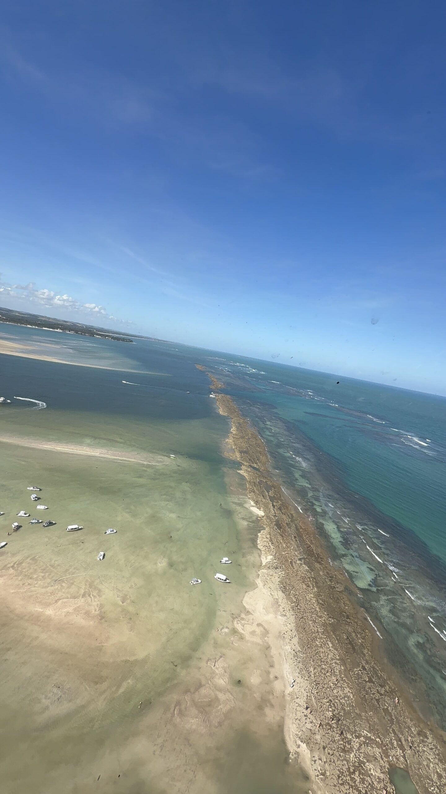 Sobrevoando: Carneiros → Tamandaré → Guadalupe → Lup Beach → Falésias de Guadalupe → Praia de Tamandaré → Piscinas Naturais → Igrejinha → Forte de Tamandaré.
